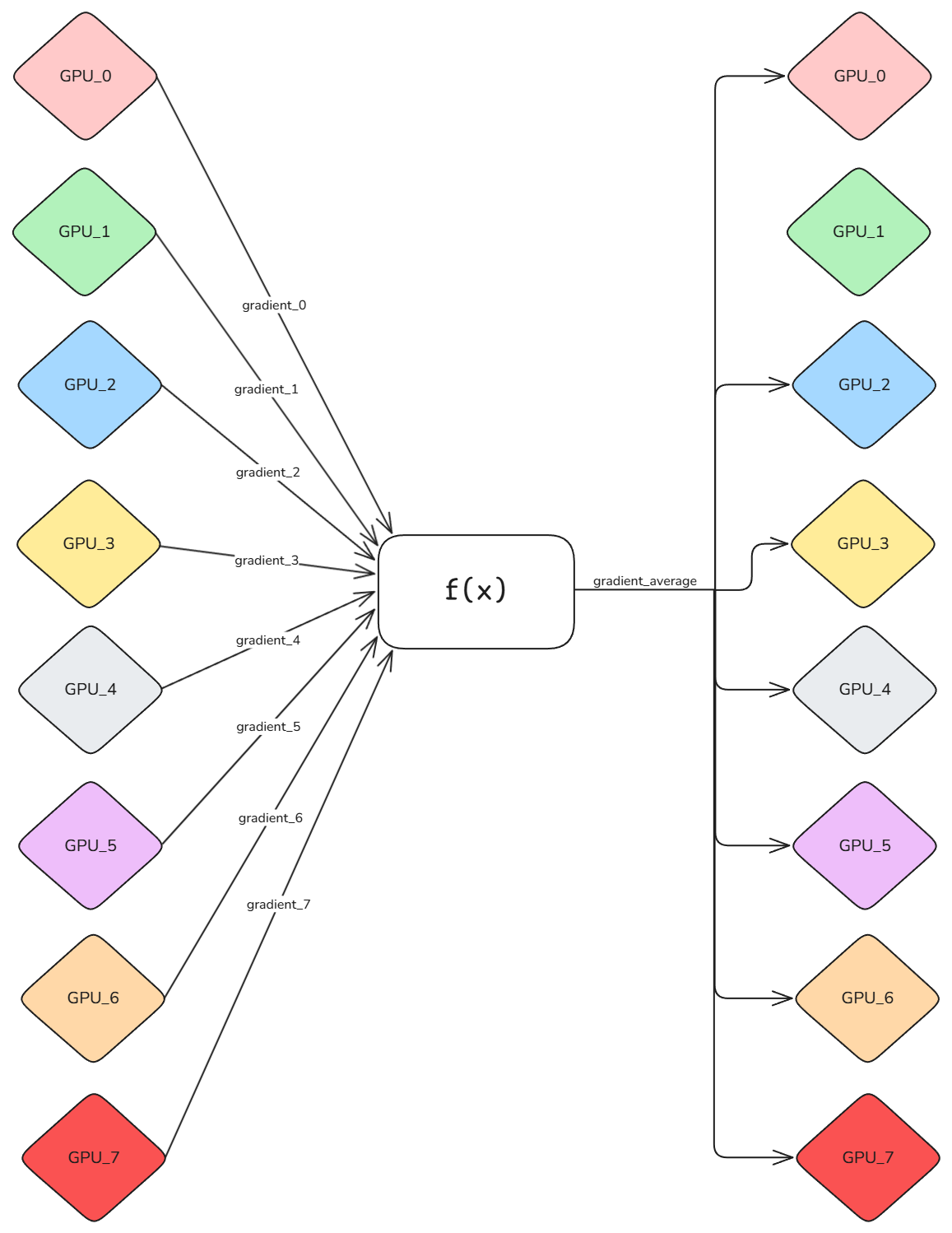 By definition, the All-Reduce operation can perform any operation f(x), and in our case we consider it to be the average. Once all the ranks receive the average of the gradients, the optimizer step can be performed on each replica, keeping them consistent across all ranks