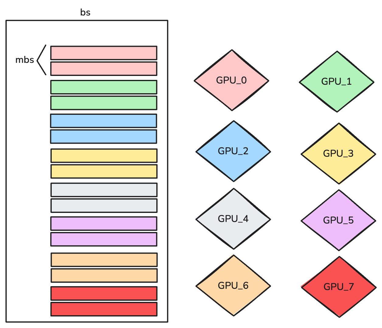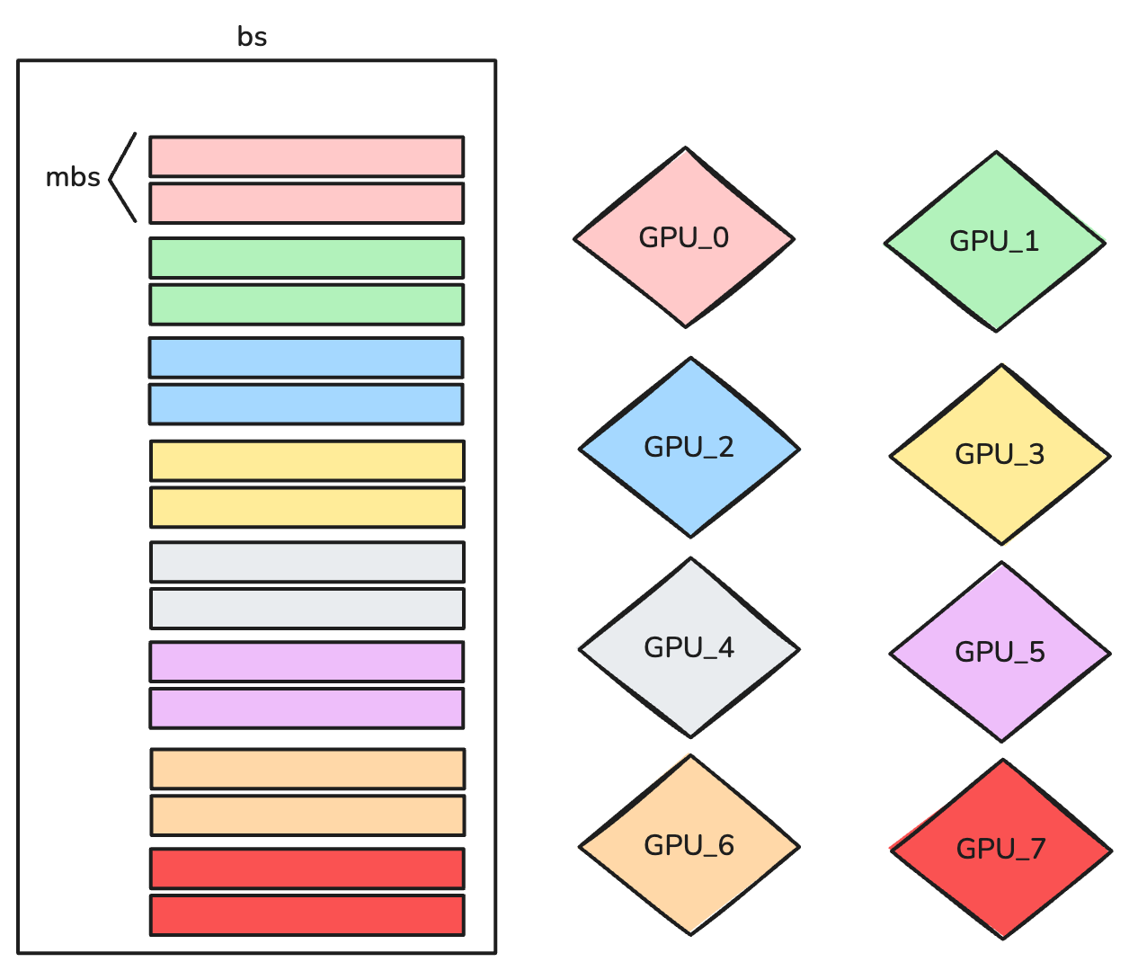 The picture below helps visualizing how the global batch, denoted as bs is split into bs/N micro-batch sizes, called mbs: