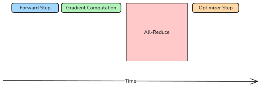 Picture this timeline: each GPU crunches through its local batch, computing gradients. Then, everything stops. All GPUs wait while the All-Reduce operation shuffles gradients around the network. Only after this communication dance completes can the optimizer finally update the parameters.