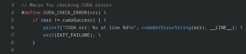 Within this macro, we utilize several CUDA-defined functions and symbols, such as cudaSuccess