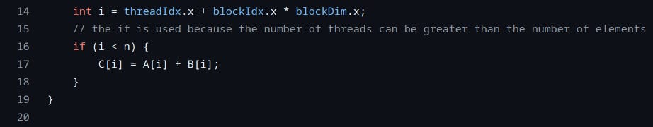 value; otherwise, all threads would operate on the same position in the vectors. Fortunately, the CUDA API provides built-in thread-specific variables that help us compute the correct positional index. Specifically, we're utilizing the following built-ins: