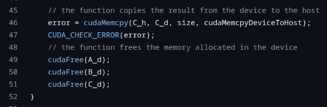 , indicating successful code execution. If this condition is not met, we invoke the cudaGetErrorString(cudaError_t)