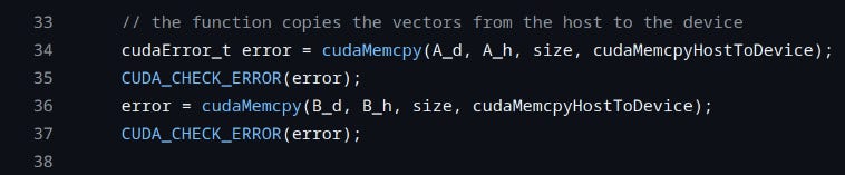 Assuming everything executes correctly, we've successfully copied the input vectors to the device memory. Hence, we can proceed to call the kernel.