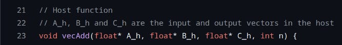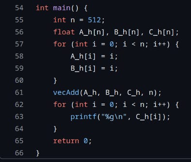 with a range from 0 to n-1. Next, we call the host code, which also invokes the kernel, and finally, we print the result stored in C_h