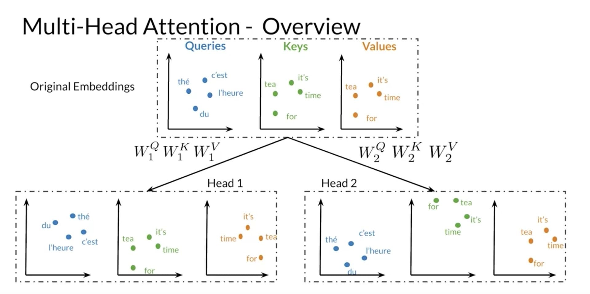 So far we’ve been looking at a single attention operation, one set of Q/K/V projections producing one attention pattern. In practice, that’s a bottleneck. One set of Q/K/V projections can only learn one “type” of relevance. But language has many simultaneous types of relationships: syntactic (subject-verb), coreference (what “it” refers to), semantic (topical similarity), positional (nearby words), and more.