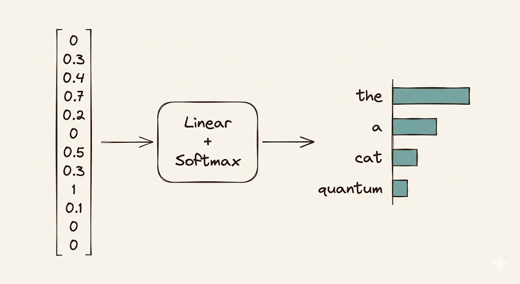 That’s it. A single vector goes into a linear layer, out comes a score for each token in the vocabulary, softmax turns those scores into probabilities, and the highest one wins (or gets sampled from, depending on your temperature settings).